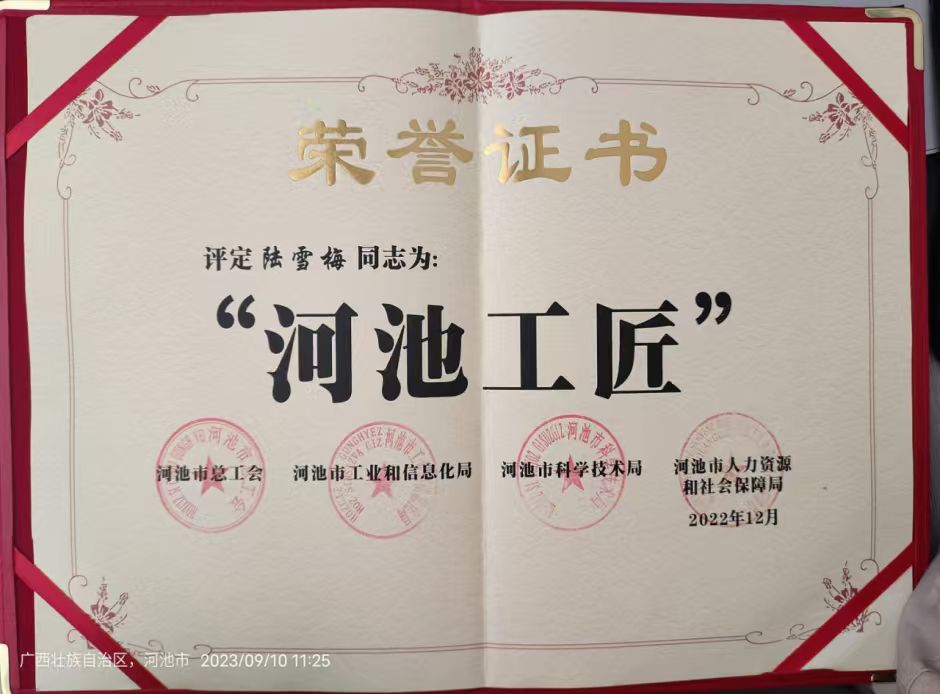 从业24年来,陆雪梅先后获得“技术状元”“十佳技术标兵”“优秀共产党员”等多项荣誉,获“先进生产工作者”荣誉6次,参加公司及南丹工会组织比赛获一等奖4次,二等奖2次,三等奖1次。2022年荣获河池市总工会、河池市工业和信息化局、河池市科学技术局、河池市人力资源和社会保障局授予“河池工匠”荣誉称号。