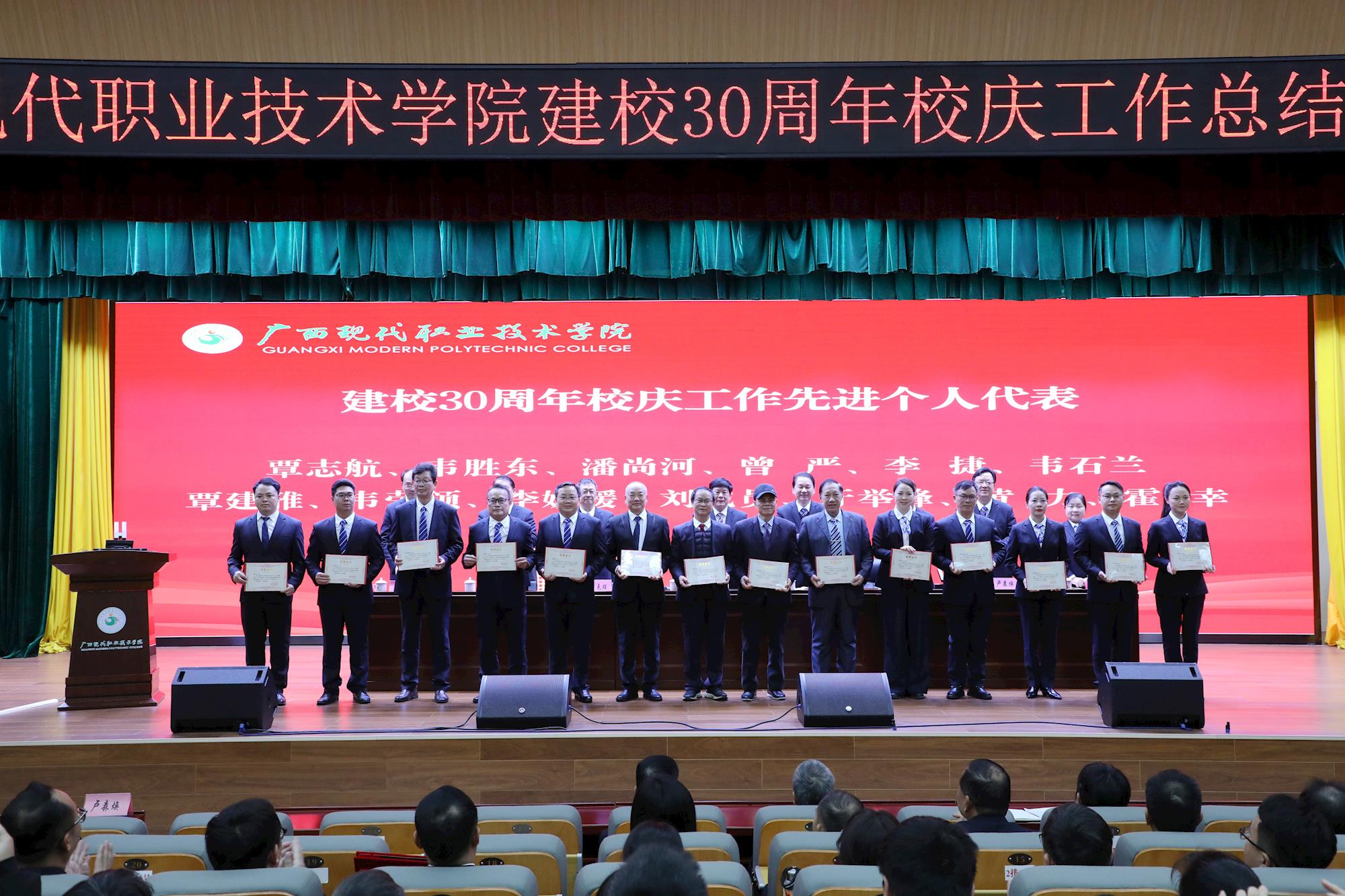2026年1月5日下午,广西现代职业技术学院建校30周年校庆工作总结表彰大会在综合楼二楼厚德报告厅隆重举行,标志着以“长歌卅载・奋发图强”为主题的校庆系列活动圆满收官。河池市政协副主席、学校党委书记韦伟松,校长黄绍光等领导班子成员及全体教职工参会。在过去的2025年,从11月27日校庆晚会温情启幕,到28日高质量发展大会、AI赋能中国・东盟职业教育高质量发展大会接连举办,这场凝聚全校心血、汇聚各界期盼的盛会,不仅全面展现了学校30年办学积淀,更以校庆为契机实现了基础设施、文化建设、品牌影响力的全方位跃升。本次总结表彰大会对14个先进集体和175名先进个人进行表彰,韦伟松、黄绍光分别发表讲话,为校庆工作画上圆满句号,也为学校新三十年发展吹响奋进号角。大会由校党委副书记、副校长杨奎主持。
