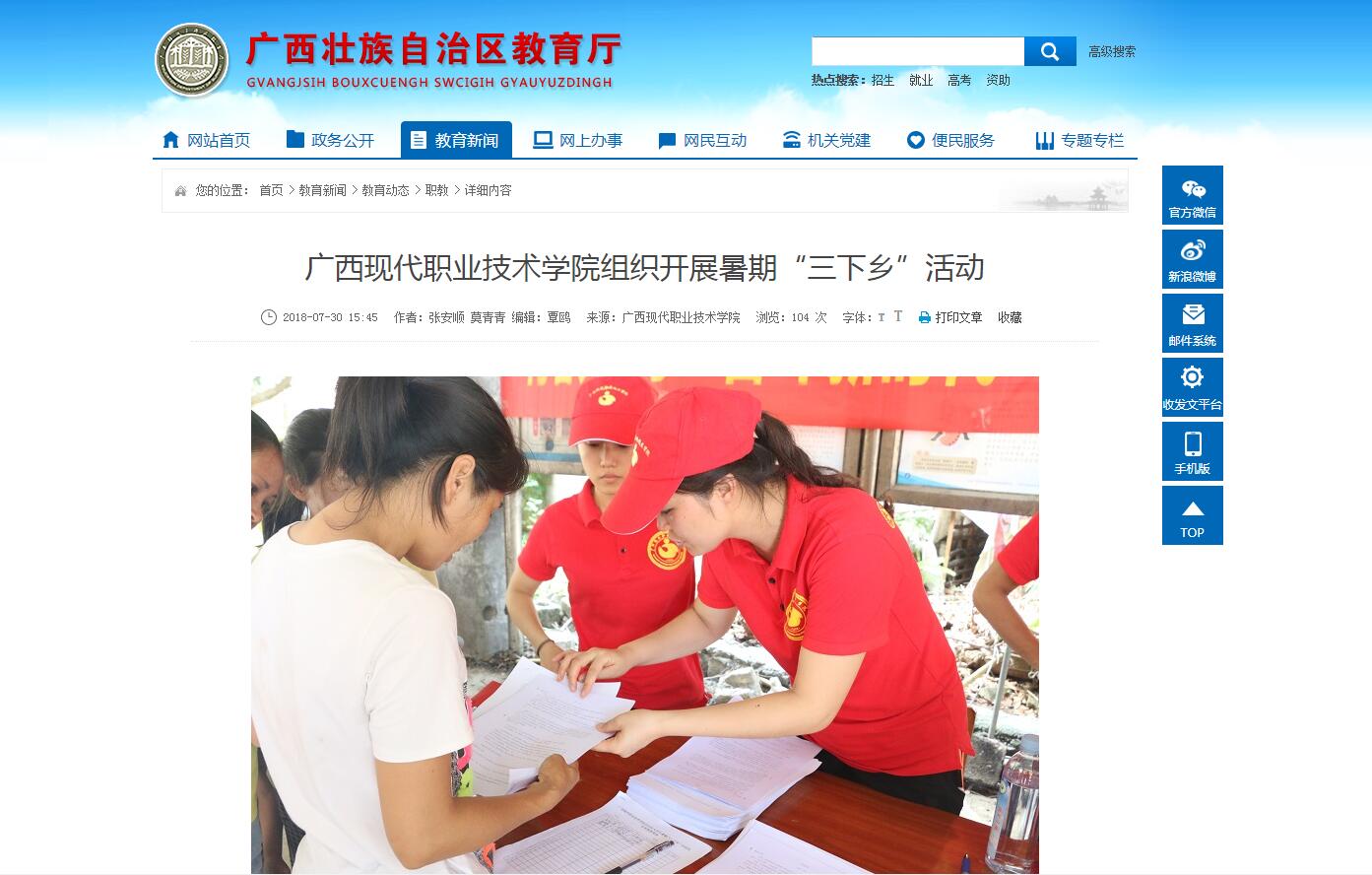 [自治区教育厅官网]广西现代职业技术学院组织开展暑期“三下乡”活动 来源: 发布时间:2018-08-08 11:12:34 浏览次数: 次 【字体:小 大】 【注:请点击以下网址进入观看】 点击网址:http://www.gxedu.gov.cn/Item/19238.aspx 新闻截图: 【打印正文】 相关信息
