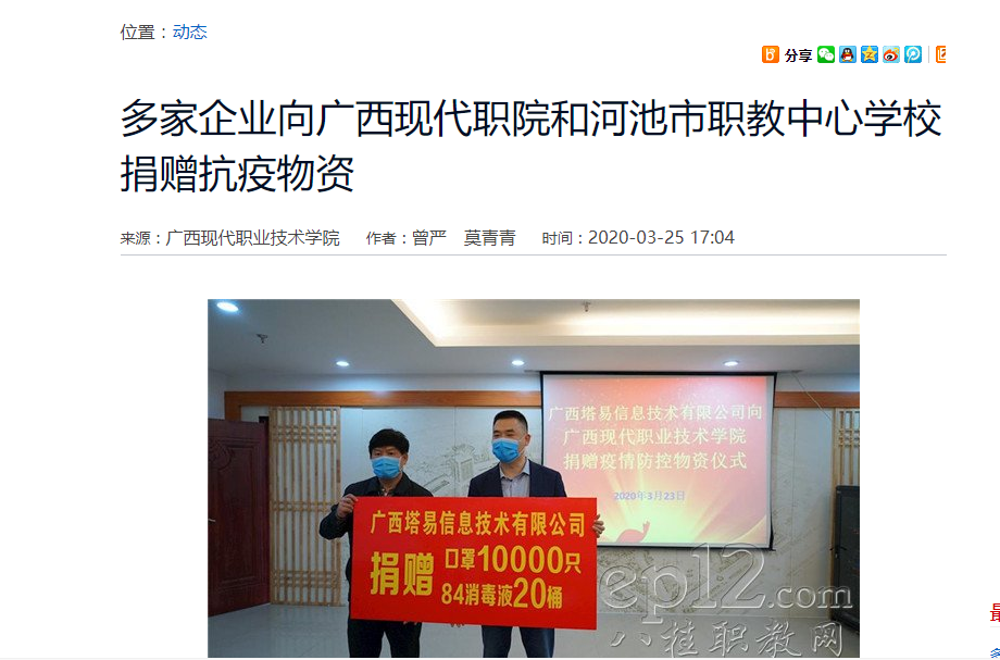 [八桂职教网]多家企业向广西现代职院和河池市职教中心学校捐赠抗疫物资 来源: 发布时间:2020-03-25 19:11:17 浏览次数: 次 【字体:小 大】 http://www.ep12.com/plus/view.php?aid=68887 终审:gxxdxcb002 【打印正文】 相关信息