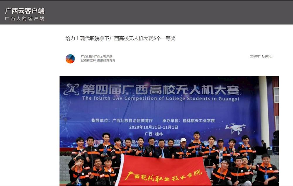 [广西日报—广西云]给力!现代职院拿下广西高校无人机大赛5个一等奖 来源: 发布时间:2020-11-04 12:02:46 浏览次数: 次 【字体:小 大】 http://resource.cloudgx.cn//files/gxapp/News/202011/03/620690.html?isshare=1&_t=1604414643 终审:gxxdxcb003 【打印正文】 相关信息