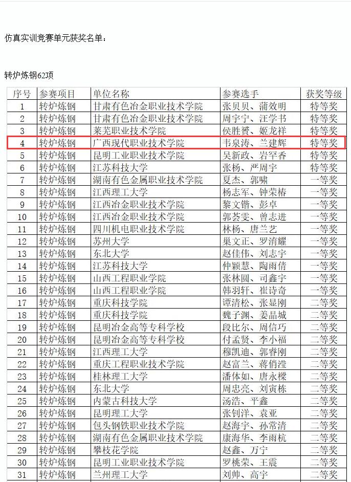 据悉,第五届全国大学生冶金科技竞赛是目前国内唯一一个由本科院校和专科院校共同参赛的冶金类高水平赛事。近年来,我校智能冶金学院先后投入1300万元建成智能冶金工业虚拟仿真实训基地,着力构建复合型冶金人才培养新模式,打造冶金产业技术技能人才培养断高地,所拥有的冶金技术专业群是广西同类专业唯一的高水平专业群。此次荣获特等奖,是学校冶金技术专业群人才培养质量不断提升的体现,也是人才培养模式不断创新发展的重要成果。