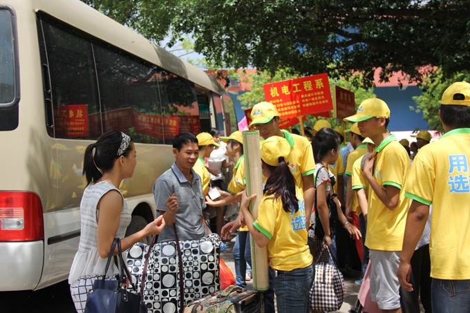 学院党委宣传部讯 年年桃李,岁岁芬芳。2012年以来,广西现代职业技术学院以提高学生和社会满意度为目标,实施内涵建设十大工程系列改革,学院各项工作逐年上档进位。今年新生录取第一轮补录就已录满,录取分数线比去年高出60分,录取新生达3000人。学院新生入学人数年年攀升,今年新生入学火爆场面更胜往年。