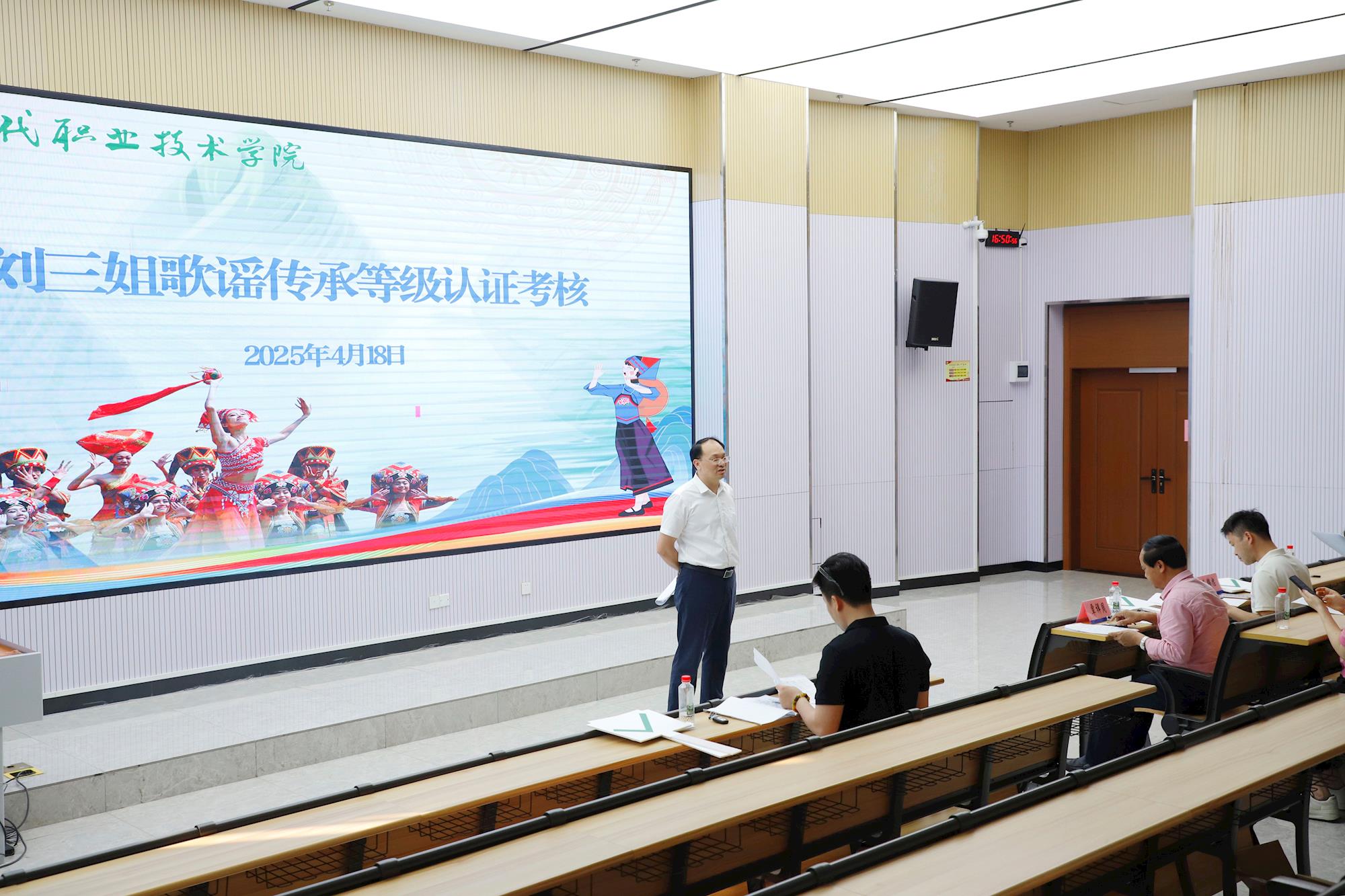 为传承优秀民族文化,铸牢中华民族共同体意识,集中展现山歌文化进校园的丰硕成果,4月18日,广西现代职业技术学院成功举办刘三姐歌谣“传承人”等级认证考核活动。学校校长黄绍光,副校长杨奎等校领导及教职工共142人参与认证,最终118人通过考核,其中12人获中级证书,整体通过率达83%。