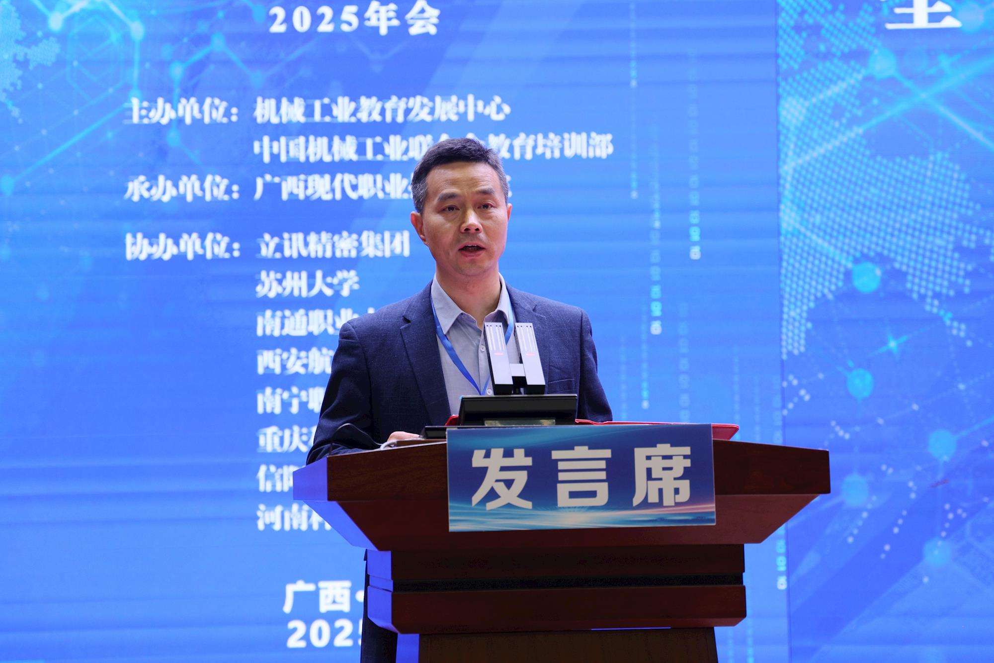 本次年会由机械工业教育发展中心、中国机械工业联合会教育培训部指导,广西现代职业技术学院携手立讯精密集团牵头主办,联合苏州大学、南通职业大学、西安航空学院、南宁职业技术大学、重庆科创职业学院、信阳涉外职业技术学院、河南科技学院等众多知名院校与行业骨干企业共同承办。会议汇聚了来自全国各地的职业院校、行业协会、企业代表,以及东盟国家高校代表齐聚一堂,共商产教融合大计,共话智能制造未来。