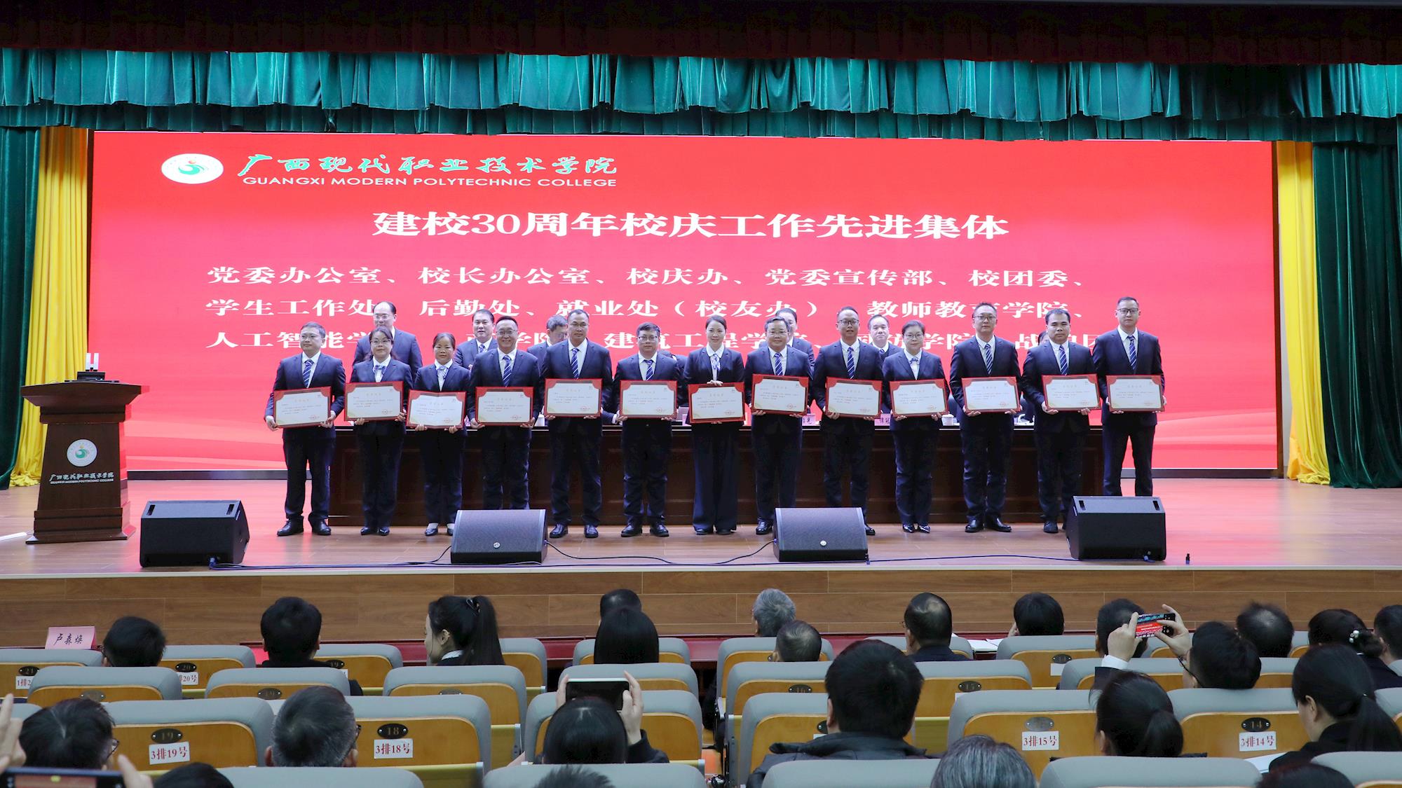 2026年1月5日下午,广西现代职业技术学院建校30周年校庆工作总结表彰大会在综合楼二楼厚德报告厅隆重举行,标志着以“长歌卅载・奋发图强”为主题的校庆系列活动圆满收官。河池市政协副主席、学校党委书记韦伟松,校长黄绍光等领导班子成员及全体教职工参会。在过去的2025年,从11月27日校庆晚会温情启幕,到28日高质量发展大会、AI赋能中国・东盟职业教育高质量发展大会接连举办,这场凝聚全校心血、汇聚各界期盼的盛会,不仅全面展现了学校30年办学积淀,更以校庆为契机实现了基础设施、文化建设、品牌影响力的全方位跃升。本次总结表彰大会对14个先进集体和175名先进个人进行表彰,韦伟松、黄绍光分别发表讲话,为校庆工作画上圆满句号,也为学校新三十年发展吹响奋进号角。大会由校党委副书记、副校长杨奎主持。