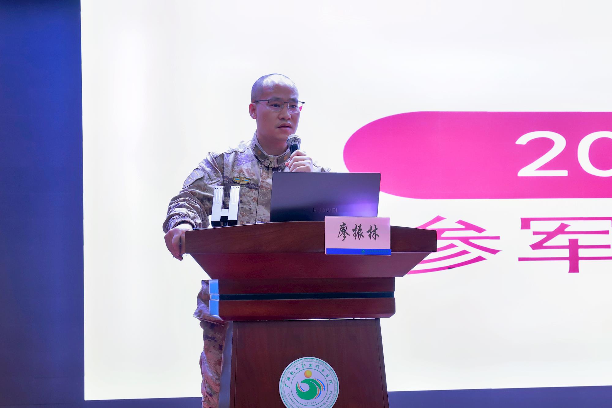 会上,廖如意高度赞扬了广西现代职业技术学院作为自治区爱国拥军模范单位、征兵工作先进单位在国防教育和兵员输送方面取得的突出成就。他结合学校优秀退役学子建功军营、服务地方的生动事例,阐述了军营锤炼人、成就人的独特价值。廖如意详细解读了2026年征兵对大学生在身高标准、年龄限制、免试专升本、留队套改等方面的最新政策红利,以及国家与地方提供的学费补偿、就业扶持、入伍奖励等全方位保障,激励青年学子将个人理想融入强军事业,让青春在军营淬火成钢,续写母校和革命老区的拥军荣光。